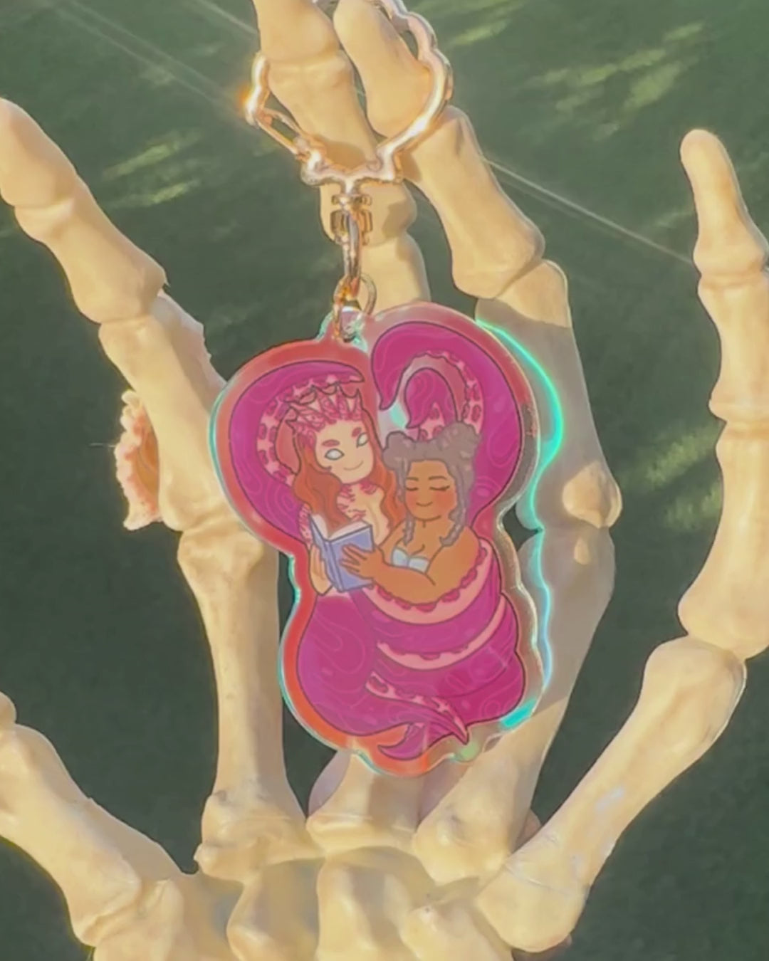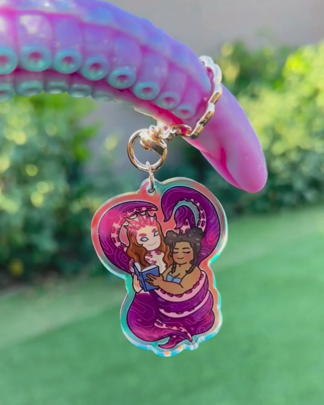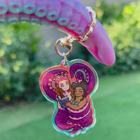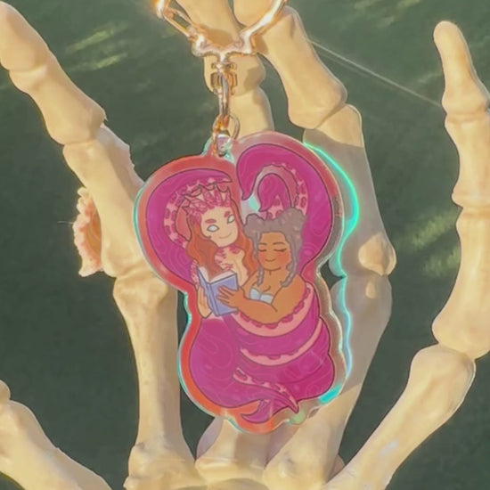 A 2.5" rainbow acrylic keychain with a clam shaped keyring featuring Impyeu's artwork of Anelisa & Cirro from Summer Lovecraft.